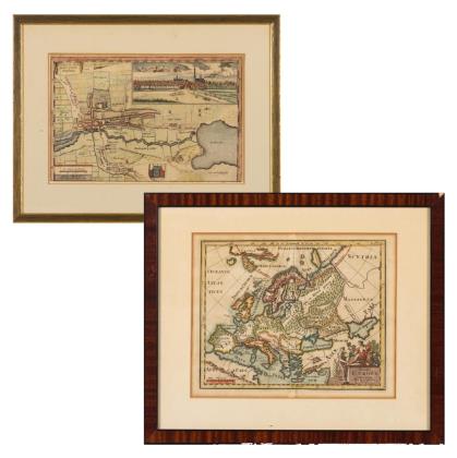 Plan von Husum: Titelkartusche "Grundtriß der Stadt undt des Schloßes Husum", Meilenzeiger und zentralperspektivische Ansicht der Stadt "Husum ao 1651", Platte: 19 x 28,5 cm, Rahmen: 31 x 40 cm, im oberen Bereich gerissen, mit Knicken und beschnitten | Phillippus Cluverius: Karte von Europa, Titelkartusche "Summa Europae Antiquae Descriptio", Meilenzeiger, Platte: 20 x 26 cm, Rahmen: 34 x 41 cm, hinterklebte Bugfalte, am Rand mit Lichtschaden