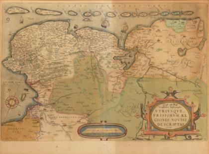 Karte der Frieslande, Titelkartusche „Oost ende West Vrieslandts Beschryvinghe. Vtrivsqve Frisiorvm regionis noviss descriptio. 1568", verso Text in Latein "Frisia"