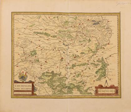 Landkarte von Thüringen: "Thuringae. Nova Descriptio", mit Titelkartusche und Meilenzeiger; aus: "Gerhard Mercator: Atlas. Das ist Abbildung der gantzen Welt mit allen darin begriffenen Laendern und Provintzen", 1633. Diese Karte war wohl für den Einzelverkauf bestimmt, da der rückseitige Text fehlt