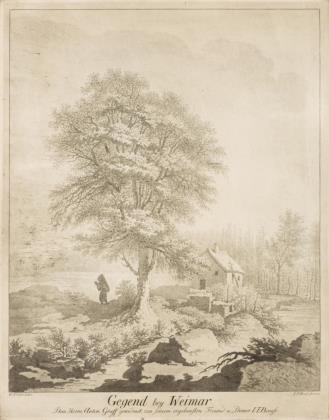 Ländliche Gegend mit großem Laubbaum und Hütte, bezeichnet "Gegend bey Weimar - Dem Herrn Anton Graff gewidment, von seinem ergebensten Freund u. Diener J. F. Bause.", nach einem Gemälde von Adam Friedrich Oeser (1717 - 1799)