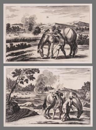 Nr. 101 und Nr. 102 der Folge "Darstellung von Pferden in freier Landschaft für Jagd/Krieg schussfest zu machen" aus G.S. Winter "Wohlberittener Cavallier"