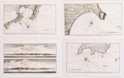 4 See- und Küstenkarten mit Darstellungen aus Mittelamerika aus George Anson´s "Voyage around the World"; Mexiko: "Plan du Havre de Chequetan ou Seguataneo" und "Vue de l´Entree du Port d´Acapulco" | Panama: "Baye et Rochers de Petaplan", ebenso in Niederländisch bezeichnet