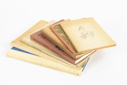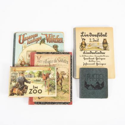 Therese Schefer: "Unserem lustigen Völkchen", Theo Stroefer's Kunstverlag, Nürnberg o.J., 36 Seiten mit vielen Abbildungen, ungefähr die Hälfte in Farblithografien. Halbleineneinband, 31 x 26 cm. Blätter lose, wenige eingerissen. / "Wer will unter die Soldaten", Zeichnungen von Felix Schmidt, Verse Steinkampf, Text Weinert. 29 Blatt mit Farblithografien. Wohl jünger nachgebunden unter Verwendung des Titelblattes. 27 x 21 cm. / "Liederfibel" 2. Teil. Kinderlieder in Bildernoten. Heribert und Johannes Grüger. Altdeutsche Verlagsanstalt Breslau; Vorsatzblatt eingerissen, Halbleineneinband, 27 x 20 cm. / "Erzählungen und Schwänke von J.P. Hebel", Bilder von Tzeschka. Verlag von Gerlach & Wiedling 1920. 96 Seiten, 15 x 14 cm. / "Im Zoo", Schreibers Stehauf-Bilderbücher. Bilder R. Fries, Verse E. Fechner. 5 Hartpappblätter mit Aufklappbildern, mehrere Defekte, 15 x 23 cm