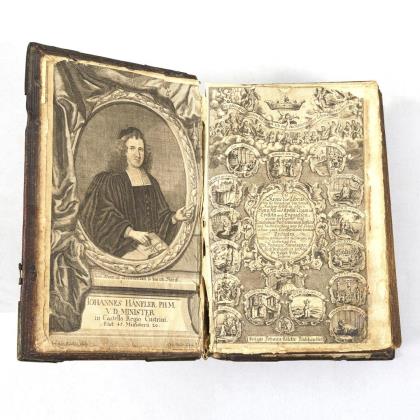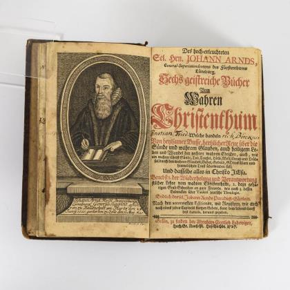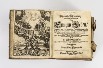 Nicolai, Philipp: "Theoria Vitae Aeternae : Oder Historische Beschreibung desz gantzen Geheimnisses vom Ewigen Leben: Darinnen aus heiliger Göttlicher Schrifft von unser Erschaffung, wie auch von unser Erlösung, deßgleichen ... in fünff Büchern erbaulich gehandelt wird". Verlegts Johann Adolph Stock, Franckfurt am Mayn 1707. Kupferstich, Titelblatt, (24), 796 Seiten. / "Heilige Geheimnisse aller vornehmsten und schweresten Leiden Jesu : worin die unter jeglichem Leiden Christi ... über die Passions-Geschichte ..., mit einer Vorrede von der nützlichsten Abhandlung und Betrachtung des Leidens Christi von Petro Busch ... (Pastor der Gemeinde zu St. Crucis, Hannover). Verlegts Johann Christoph Meißner, Wolfenbüttel (um 1736). Porträtkupfer, Titelblatt, (16), 704, (24) Seiten. / Geprägter Pergamenteinband, Rotschnitt