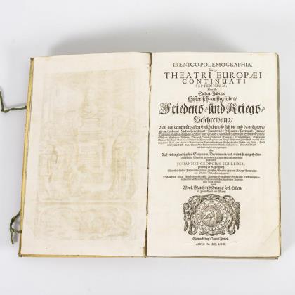 Titelkupfer, Titelblatt, (86) Seiten mit 11 ganzseitigen Kupferstichen und einer Landkarte, 394, 256, (12), Titelblatt, 186 Blatt. Geprägter Ledereinband mit originalen Schließen