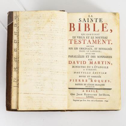 Bibel in französischer Sprache, 7 Blätter im Vor- und Nachsatz eng handschriftlich beschrieben. Goldgeprägter Ledereinband
