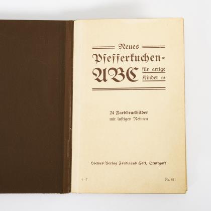 24 Blatt einseitig mit Farblithografien zum Alphabet gestaltet. Buchdeckel sieht aus wie ein Lebkuchen mit reliefiertem Mandelmuster