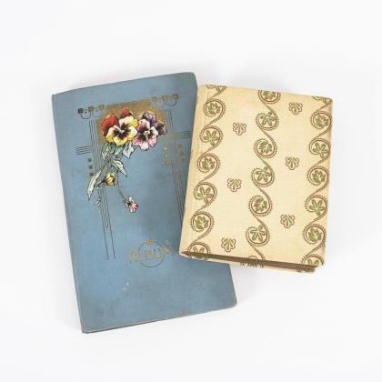 Blauer Einband mit Stiefmütterchen und beiger Einband mit Rankenmuster