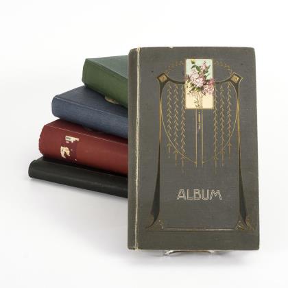 Ein Album mit ca. 86 Karten nur Nordafrika, grüner Einband "Postkarten-Album", 26 x 21 cm. / "Kriegs-Erinnerungen" mit ca. 10 Karten I. Weltkrieg, im kleinen, grauen Album, 12 x 18 cm. / Ca. 129 Motivkarten im grünen "Album" mit Tänzerin. 28 x 23 cm. / Ca. 200 Ansichtskarten mit zahlreichen topografischen Ansichten, aber auch Militär, Farblithografien u.a., im roten "Postkarten-Album", 33 x 25 cm