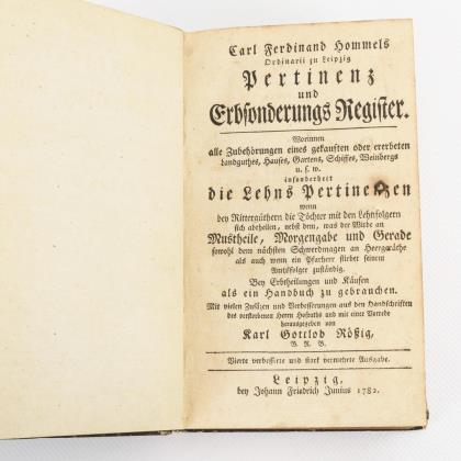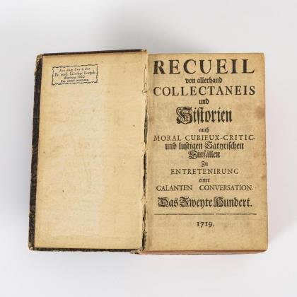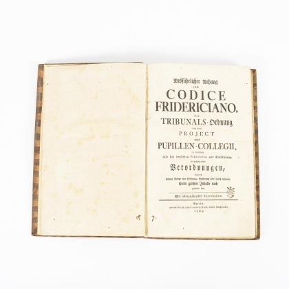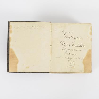 Titel, 374, 8 Seiten. Eingeheftete 8 Seiten handschriftliches "Taufformular" sowie am Ende 45 handschriftliche Seiten wohl historischen Inhaltes. Ledereinband