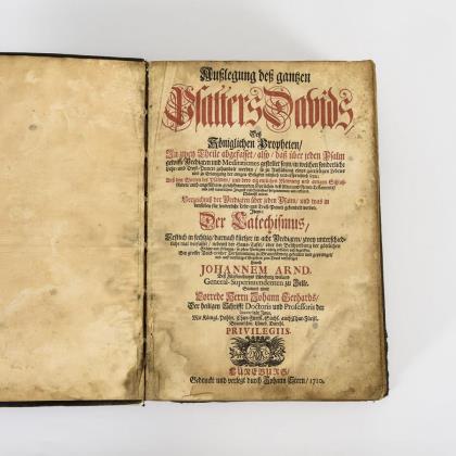 Titelblatt, (28), 864, 374, 310 Seiten. Vorrede des Herrn Johann Gerhards. Ledereinband