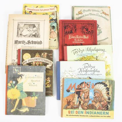 Kreidolf: "Die Wiesenzwerge", Verlag Schafstein & Co, Cöln, (24) Seiten mit ganzseitigen Farblithografien. / "Moritz Schwindt - Bilderbogen", Braun & Schneider, München, Broschur. / Sixtus; Heinrich: "Der Zuckertütenbaum". Verlag Hegel & Schade, Leipzig 1928, Farblithografien und von Kinderhand ausgemalte Strichzeichnungen. / "Mecki bei den Indianern", Hammerich & Lesser Verlag, Hamburg 1956. / Krüss; Maillard: "Hanselmann hat große Pläne", Stallingverlag, Oldenburg 1954. / 2x Baumgarten, Hahn: "Teddys Schulgang" und "Teddys Weihnachten". Titania-Verlag Stuttgart. / "Ludwig Richter-Buch" 62 Zeichnungen, Text von Siebe. Verlag von Georg Wiegand, Leipzig o.J., geprägter Leineneinband. / Krüss; Paxmann: "Susebilles grosse Reise", Stalling Verlag, Oldenburg 1957. / Dieck; Holst; Jordan: "Guck hinein! Schaut der Tiere Kinderlein!" Stuttgarter Kinderbücher Nr. 2, Dieck & Co. Verlag