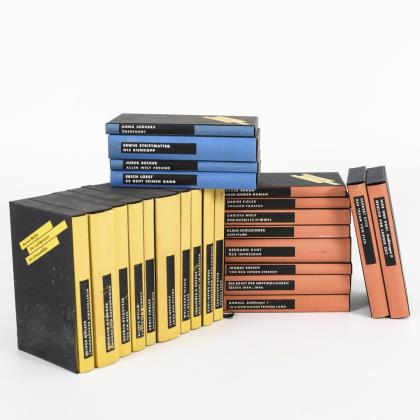 Vorzugsausgabe mit einer Auflage von 300 Exemplaren. Leineneinbände im Schuber. Irmtraud Morgner: "Amanda", Grafik: Harald Metzkes / Erik Neutsch: "Spur der Steine", Grafik: Willi Sitte / Christa Wolf: "Der geteilte Himmel", Grafik: Nuria Quevedo / Thomas Brasch: "Vor den Vätern sterben die Söhne", Grafik: Volker Stelzmann / Christopher Hein: "Horns Ende", Grafik: Rolf Münzner / Volker Braun: "Hinze-Kunze-Roman", Grafik: Baldwin Zettl / Adolf Endler: "Schichtenflotz", Grafik: R.A. Penck / Heiner Müller: "Der Lohndrücker", "Die Umsiedlerin", Grafik: Xago Schröder / J.R. Becher: "Der Aufstand im Menschen", Grafik: Karl-Georg Hirsch / Hanns Eisler: "Johannes Faustus", Grafik: Bernd Heisig / Erich Loest: "Es geht seinen Gang ...", Grafik: Ulrich Hachulla / Hermann Kant: "Das Impressum", Grafik: Joachim John / "Die Kraft der Empfindlichkeit" Essays 1949 - 1990, Grafik: Hermann Naumann / Wolfgang Hilbig: "Die Weiber", Grafik: Hans Ticha / Klaus Schlesinger: "Alte Filme", Grafik: Hartwig Ebersbach / Erzählungen 1949 - 1969, Grafik Dieter Tucholke / Erzählungen 1970 - 1990, Grafik Wolfgang Henne / Erwin Strittmatter, "Ole Bienkopp", Grafik: Gudrun Brüne / Herbert Otto: "Der Traum vom Elch", Grafik: Klaus Süß / Werner Heiduczek: "Tod am Meer", Grafik: Wolfgang Mattheuer / K.-H. Jakobs: "Beschreibung eines Sommers", Grafik: Frank Ruddigkeit / Alfred Welm: "Pause für Wanzka", Grafik: Christ Jahr / Jurek Becker: "Aller Welt Freund", Grafik: Sighard Gille / Anna Seghers: "Überfahrt", Grafik: Heidrun Hegewald