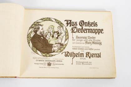 65 Seiten mit Noten, eingefasst in schönen Bilderschmuck (Farblithografien) mit Bezug zu den Liedinhalten