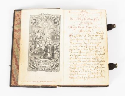 Handgeschriebenes religiöses Buch mit Kupferstichen
