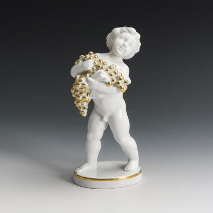 Stehendes Mädchen, zwei üppig gefüllte Blumenkörbe tragend
