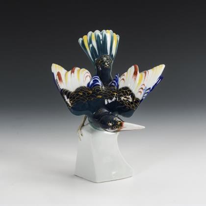 Schlanke, ovoide Form mit umlaufendem Reliefband mit Blumen und Papagei