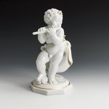 Bewegte Figur eines knienden, eine Querflöte spielenden Knaben
