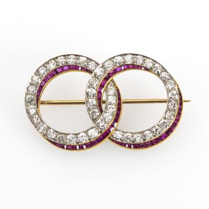 Art-déco-Doppelringbrosche mit Altschliff-Brillanten und Rubinen
