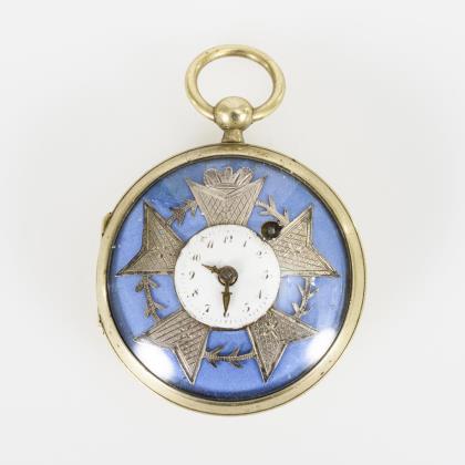 Spindeltaschenuhr mit blauem Zifferblatt und bekröntem Kreuz