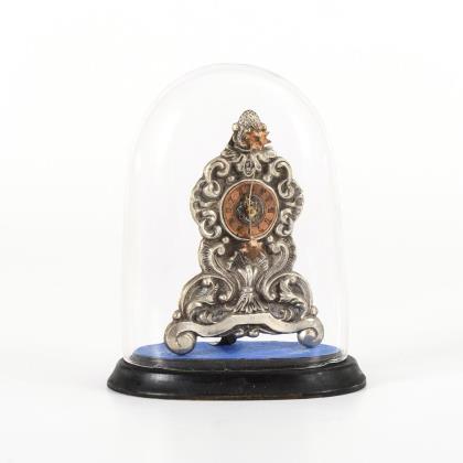 Historistische Uhr in taillierter Form mit Rocaille-Reliefs. Auf ebonisiertem Ovalsockel mit Glasdom