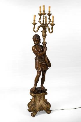 Reich reliefierter Leuchter mit figürlichem Schaft als Putto. Schauseitig 2 gravierte, bekrönte Wappenschilde und Datierung: "3. August 1853 - 3. August 1883"