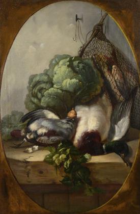 Undeutlich signiert: Jäger in dekorativem Goldstuckrahmen