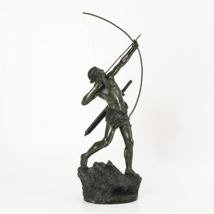 Jugendlicher Jäger im Fellschurz, der entschlossen und kraftvoll seinen Bogen spannt