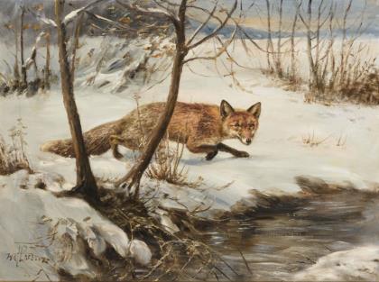 Das Tier in schleichender Haltung nahe einem Bach im Winter