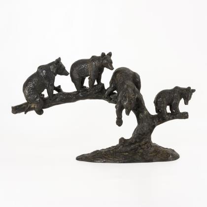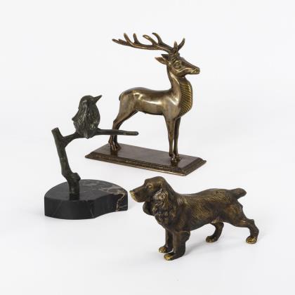 3 jagdliche Bronzen: Hirsch, Hund sowie Vogel auf einem Ast