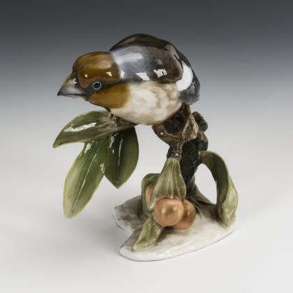 Kakadupärchen auf Ast (H 26,5 cm) und Wellensittichpärchen auf einem Fruchtast (H 14,5 cm)