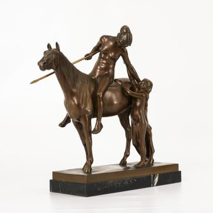 Akt einer jungen Frau zu Pferd, die in ihrer Linken die (originale) Lanze hält, während sie sich zu ihrer ebenfalls nackten Tochter herunterbeugt