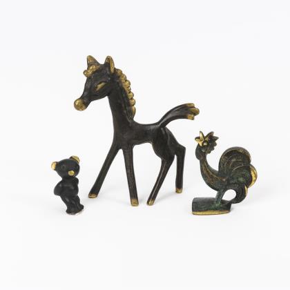 3 kleine Bronze-Tierfiguren: Pferd, Hahn und Bär