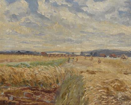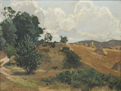 Bergige Landschaft mit Kornhocken auf den Feldern