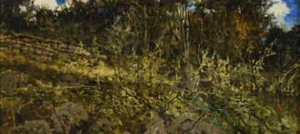 Impressionistische Studie mit Blick einen Hang hinauf über wild wachsende Pflanzen vor der Mauer zum Waldrand