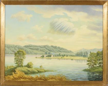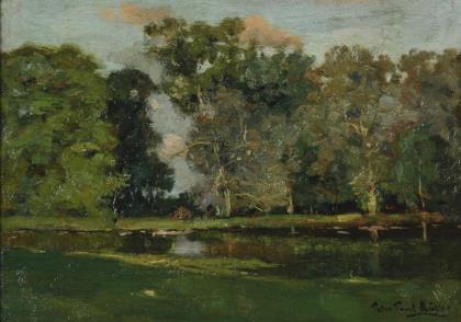 Impressionistische Studie mit Blick übers Wasser zu den Bäumen unter blauem Himmel