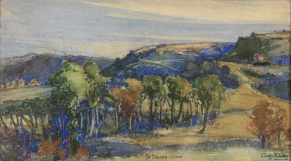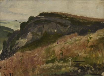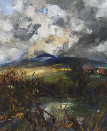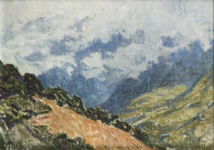 Kleine Landschaftsstudie mit Blick vom Berg über das Tal zu den Wolken und dem Gebirge am Horizont