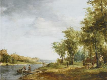 Flusslandschaft im Sonnenschein mit Staffagefiguren nahe dem Dorf
