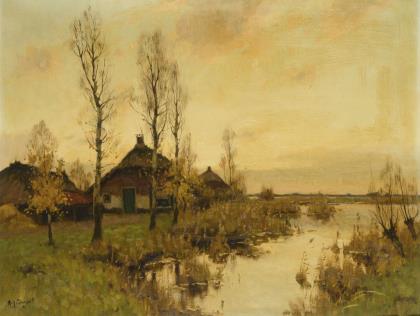 Weite Flusslandschaft mit Dorfhäusern im Abendlicht