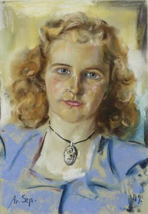 Porträt einer jungen Frau mit blond gelocktem Haar