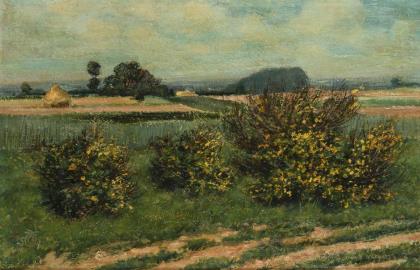 Weite flache Felderlandschaft mit blühenden Büschen an einem Sommertag