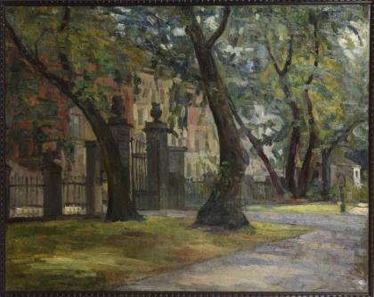 Breite Einfahrt mit gusseisernem Tor vor großem Gebäude