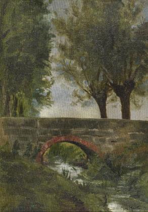 Brücke über Bach mit den Weiden vor dem Wolkenhimmel