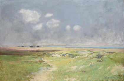 Weite flache Küstenlandschaft mit einem Dorf nahe dem Strand unter weitem Himmel