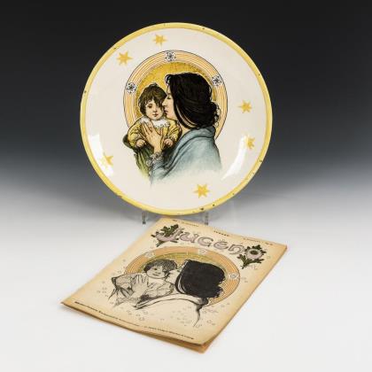 Runder Teller mit liebender Mutter-Kind-Darstellung. Vorlage auf Titelseite der Zeitschrift "Jugend", Münchner illustrierte Wochenschrift für Kunst und Leben, G. Hirth`s Verlag in München & Leipzig, Ausgabe 25. Dezember 1897, II. Jahrgang, Nr. 52