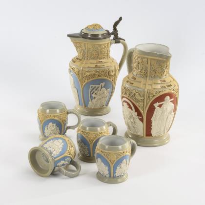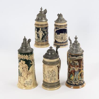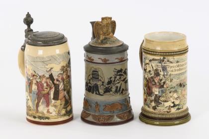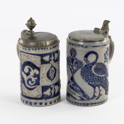 Modelkrug mit Pferden. Zylinderkrug mit 2 Pfauen und einem Hirsch. Beide mit Zinndeckel, teils innen gepunzt