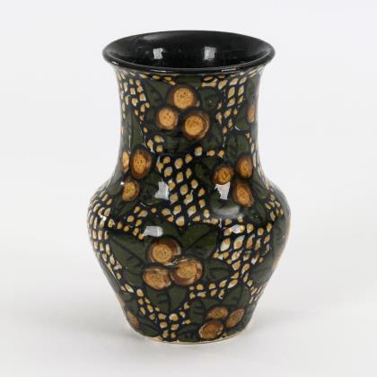Leicht gebauchte Form mit weitem Zylinderhals. Florale Bemalung in Grün, Weiß, Gelb und Schwarz