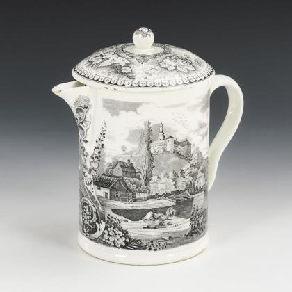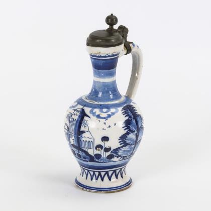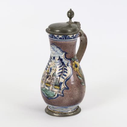 Birnform mit endvolutiertem Bandhenkel. Rocaillierte Kartusche mit einer Schlossansicht. Flacher Zinndeckel mit Kugeldrücker, Zinnstandring