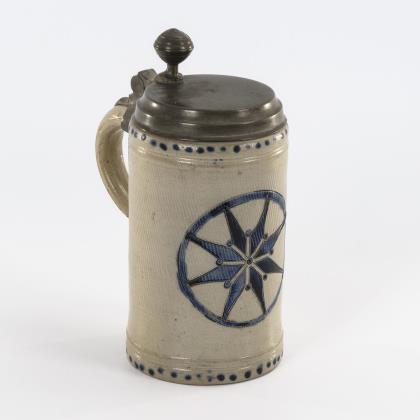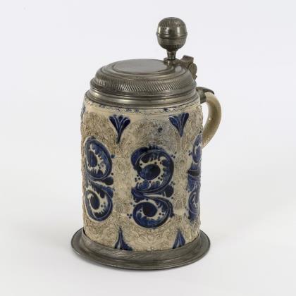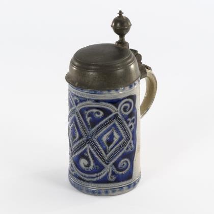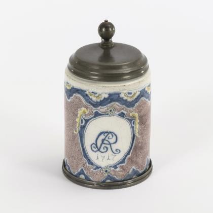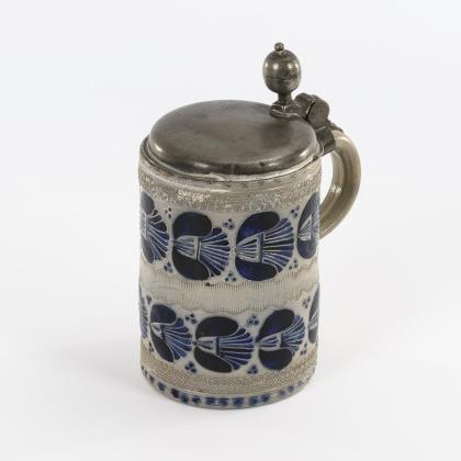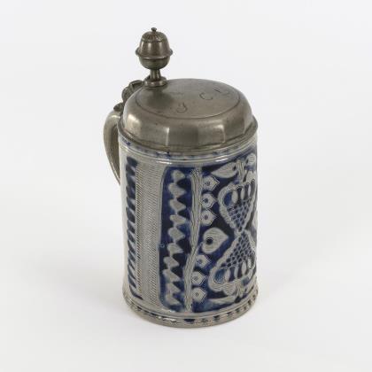 Walzenkrug mit Bandhenkel. Schauseitig im Wappen monogrammiert "CJR (?)" und datiert "1717". Jünger ergänzter Zinndeckel und Zinnstandring