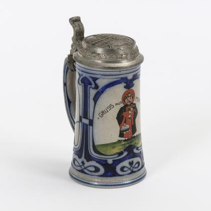 Konischer Reliefkrug mit Jugendstil-Dekorbändern, schauseitig ein farbig aufgemalter Geistlicher mit Bierkrug. Reliefierter Zinndeckel mit Ansicht des Münchner Hofbräuhauses